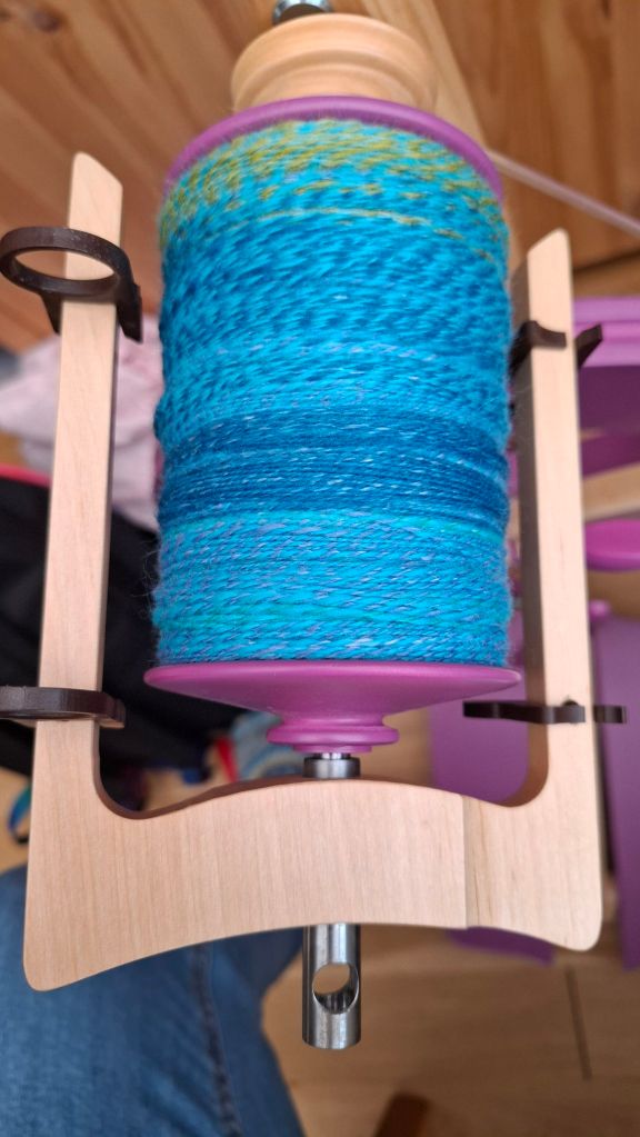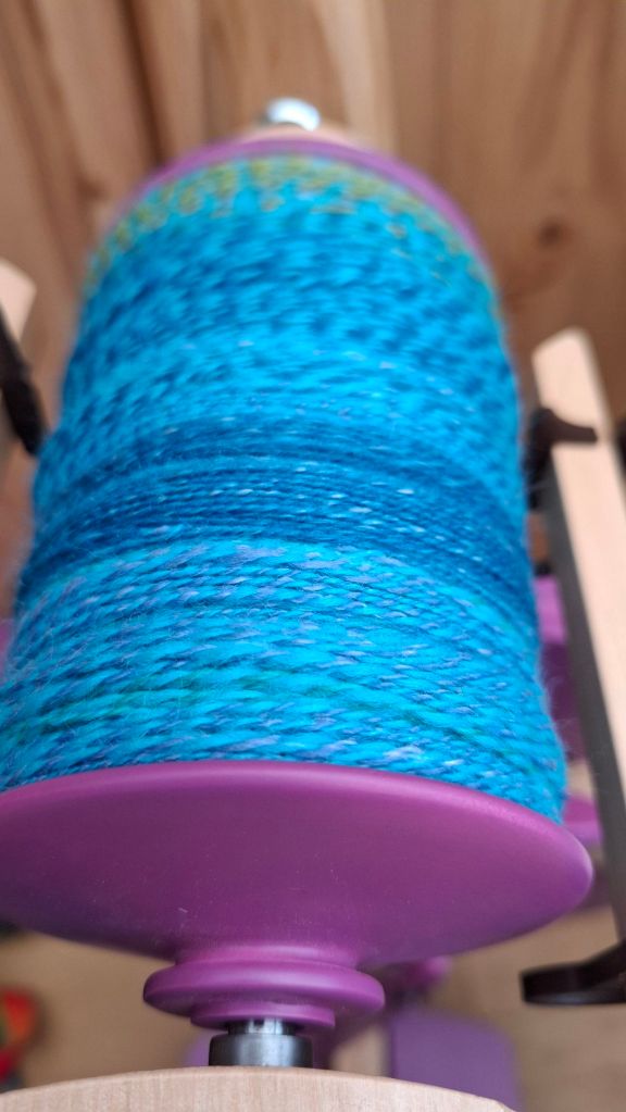Het twijnen bleek nog best een uitdaging, ik heb de klos werkelijk ramvol gedraaid maar mijn 100g paste er maar nét op.