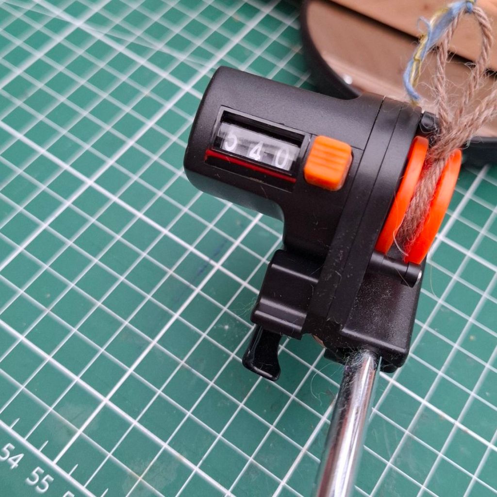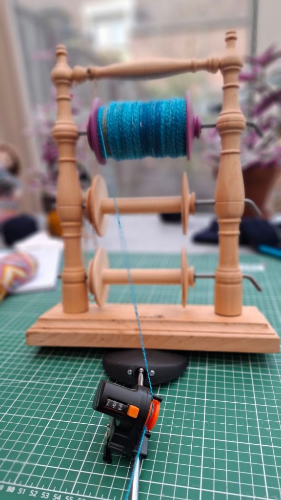 Ik had nog een tweede speeltje om uit te testen, een lijnmeter die normaal bij sportvissen wordt gebruikt. Het idee is dat je de wol erlangs haalt terwijl je het van de klos op de niddy noddy draait. Terwijl het draad langs een wieltje in de meter draait, wordt de lengte van de draad gemeten. Ik weet niet of ik het veel vaker zou gebruiken want de draad liep er een paar keer af en het metertje ging alle kanten op voor ik het vastmaakte, maar voor een keertje was het wel echt geinig. Want tot mijn grote verbazing bleek dit mooie spinsel maar liefst…
