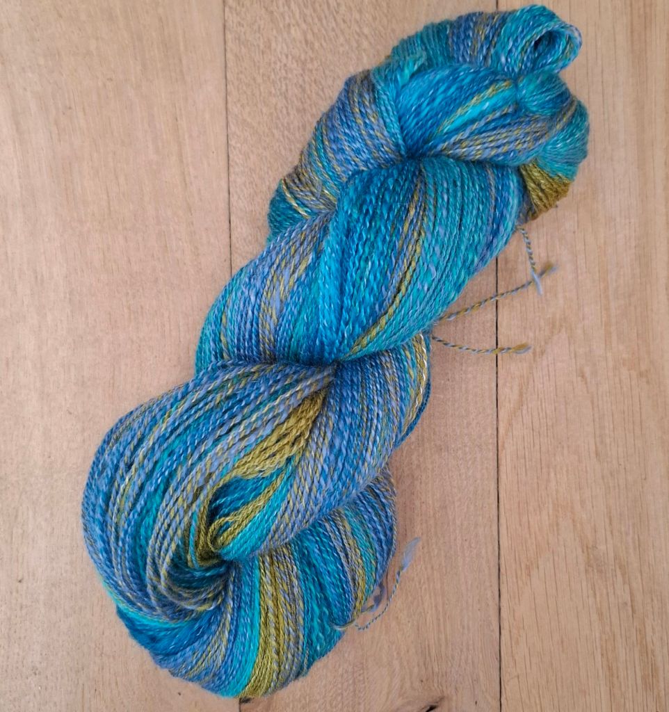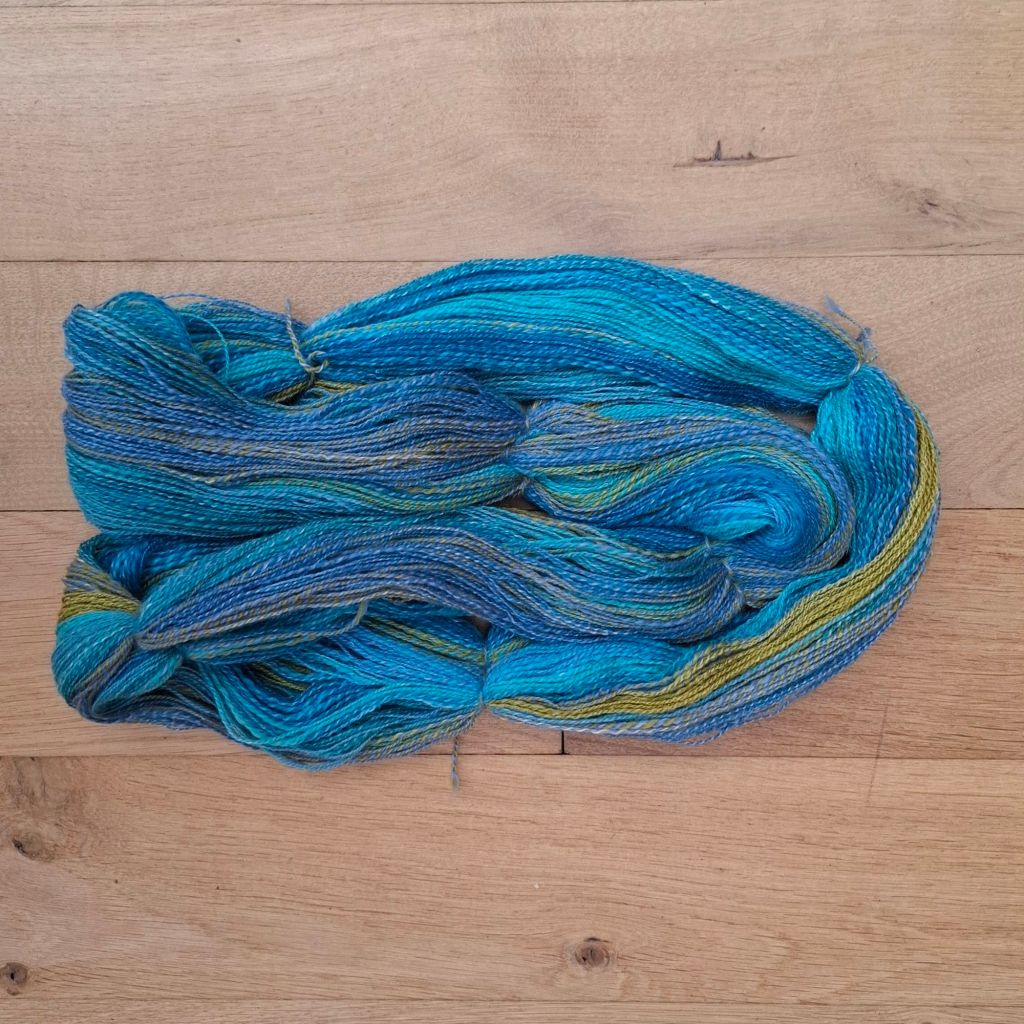 Om het wiel eens goed te testen besloot ik om me te richten op een vrij dunne single, ongeveer lace dikte, om uiteindelijk met een 2ply uit te komen op zo’n beetje sokkendikte (400m/100g)
