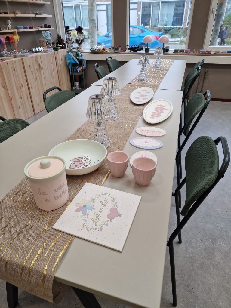Na een korte uitleg konden we aan de gang. Er zijn koffiekopjes gemaakt, fruitschalen, tapasschotels, naambordjes en zelfs een koekjespot.